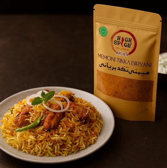 Memoni Tikka Biryani banane ke liye sabse pehle chicken ke tukdon ko dahi, adrak-lehsan paste, lemon juice, High Spice Memoni Tikka Biryani Masala, laal mirch, haldi aur thora sa oil daal kar ache se marinate kar lein aur 1–2 ghantay ke liye rakh dein. Is ke baad in marinated chicken pieces ko grill ya fry kar lein jab tak woh golden brown aur cooked na ho jayein. Dusri taraf basmati chawal ko 80% tak ubaal lein aur side mein rakh dein. Ab ek pateele mein thora oil garam karein, is mein pyaaz golden brown karein, phir tamatar aur thora sa biryani masala daal kar bhun lein. Ab is masalay mein chicken tikka pieces daal dein. Ab ek layer chawal ki bichayein, phir chicken masalay ki, aur phir se chawal ki layer. Har layer par hara dhaniya, podina aur thora sa zarda rang mila paani chhidkein. Upar se 2-3 chamach ghee daal kar biryani ko dum par rakh dein 15–20 minutes ke liye. Jab chawal ache se steam le lein to biryani tayar hai. Serve karein garma garam raita, salad aur lemon ke sath – aur asli Memoni zaiqe ka lutf uthayein!