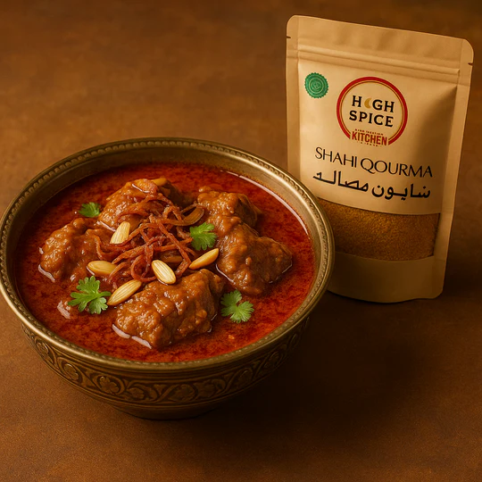 Shahi Qourma banane ke liye sabse pehle 1 kg gosht ko ache se dho kar side mein rakh dein. Ek pateele mein 1 cup oil garam karein, is mein 2-3 bare size ke pyaaz thin slices mein kaat kar golden brown hone tak fry karein. Thoda sa pyaaz nikal kar garnish ke liye alag rakh lein. Ab is mein adrak-lehsan paste daal kar halki aanch par bhun lein. Phir gosht daal dein aur 8–10 minutes tak achi tarah se bhunain jab tak gosht ka pani khushk ho jaye. Ab 1 cup dahi, 2 tablespoon High Spice Shahi Qourma Masala, thora haldi aur laal mirch powder daal kar mazeed 10–15 minutes tak bhunain jab tak masalay ka tel alag na ho jaye. Zarurat ke mutabiq pani daal kar gosht ko naram hone tak pakaayein. Aakhir mein thora sa kewra paani, choti ilaichi, aur fried pyaaz daal kar 5 minutes dum dein. Chahain to thoda sa badam paste ya cream bhi shahi touch ke liye add kiya ja sakta hai. Garma garam naan ya parathay ke sath serve karein – ek dum royal zaiqa ke sath!